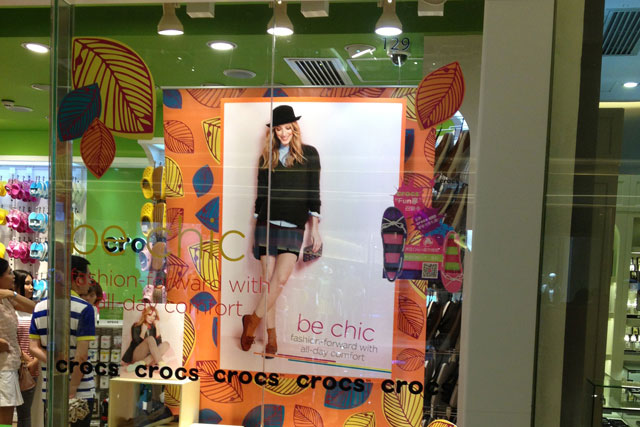 深圳生彩喷绘为Crocs卡洛驰国际,提供广告物料的加工生产,包括展示道具,挂画,橱窗贴纸,透明贴纸,电脑界字玻璃贴,电脑刻字贴,正喷灯片,韩国灯片,柜台3M贴,橱窗陈列地贴,PVC广告板,产品陈列道具,亚克力展示制品等等。