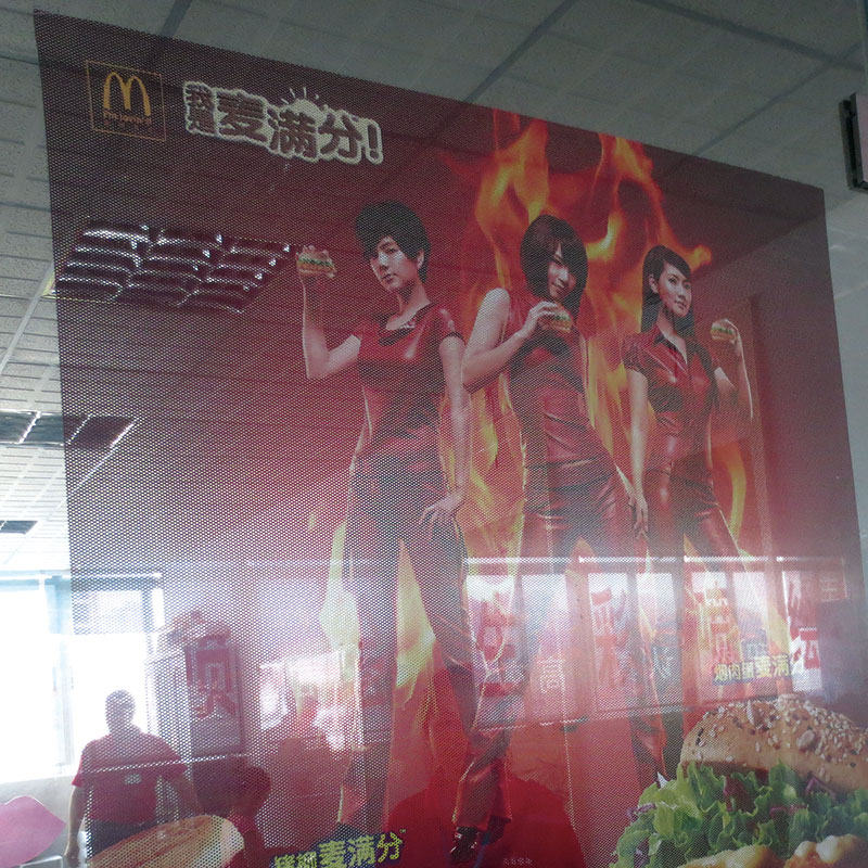 单孔透表面分布了很多圆孔,适合于粘贴在玻璃上,具半透明效果,适用于商场玻璃幕墙以及巴士玻璃窗,