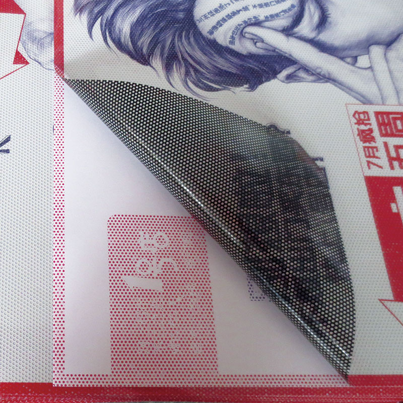单孔透表面分布了很多圆孔,适合于粘贴在玻璃上,具半透明效果,适用于商场玻璃幕墙以及巴士玻璃窗,防水防晒。