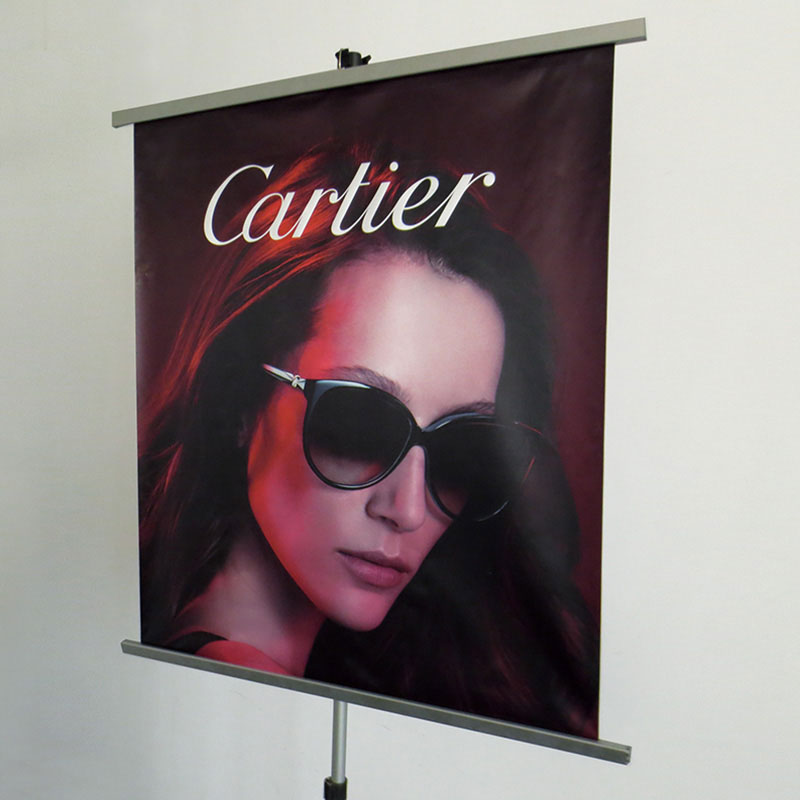 旗、刀旗、易拉宝、拉网展架、彩易展系统、快幕秀、促销台、L形展架、人像立牌、海报架等。