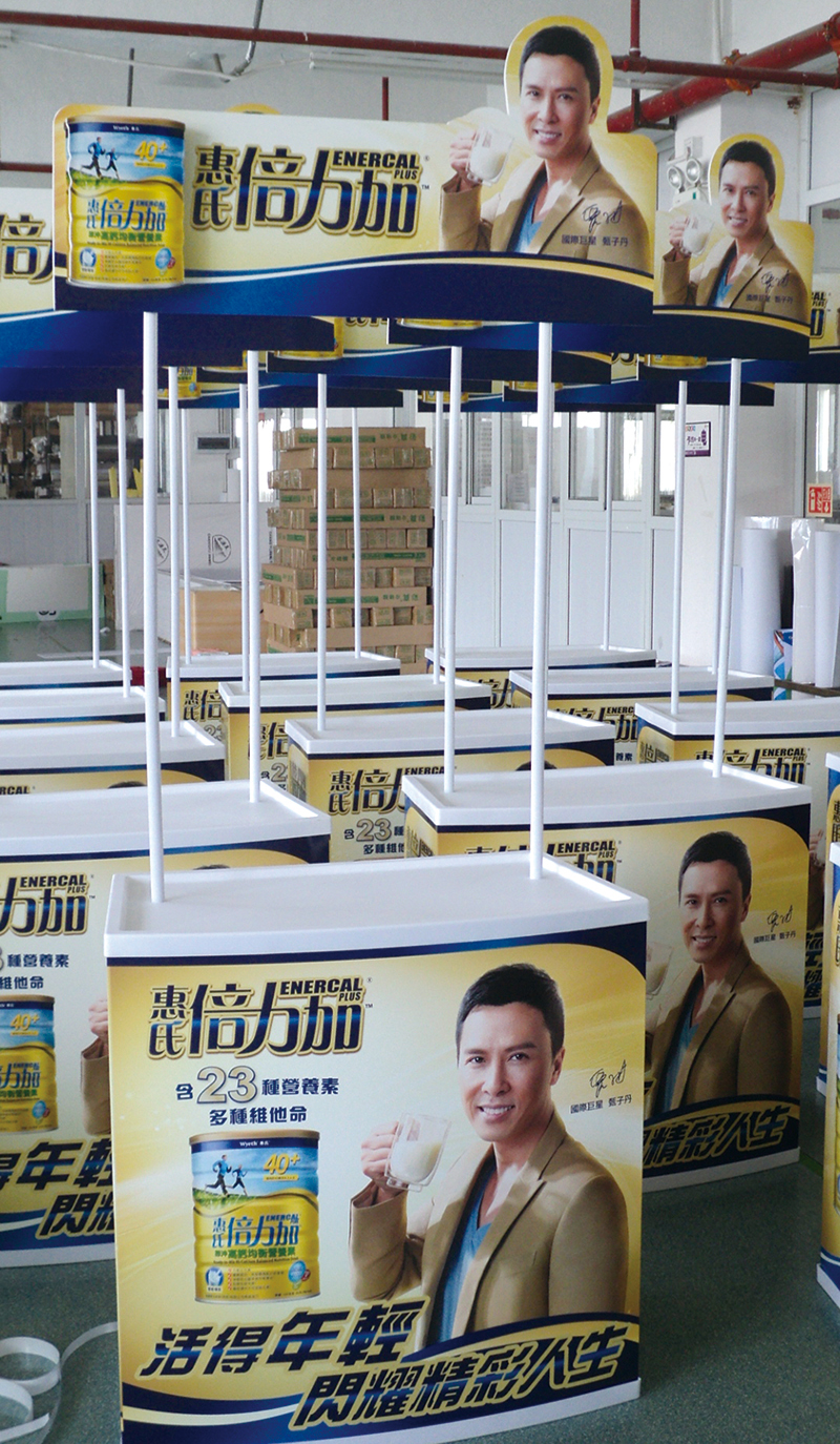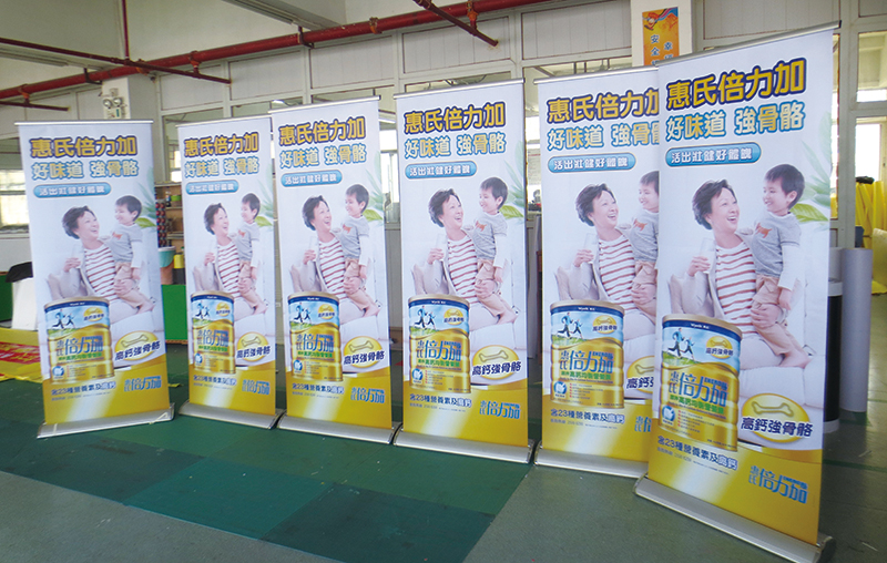 香港惠氏集团是我司的战略合作伙伴,我司主要给惠氏奶粉系列产品生产广告用促销台和易拉宝,促销台包括吸塑促销台,全铝合金促销台。易拉宝主要是宽底豪华易拉宝,易拉宝画面采用专业级PVC胶片,平整,不卷边。