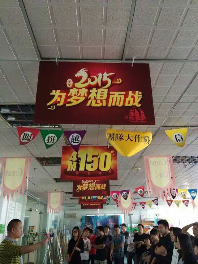 公司制定了2015财年的奋斗目标,确定每个部门的业绩目标,团队间进行PK,队员确立自己的奋斗梦想。“为梦想而战”宣誓仪式启动。我们全力以赴,争做珠三角数一数二的品牌喷绘公司。