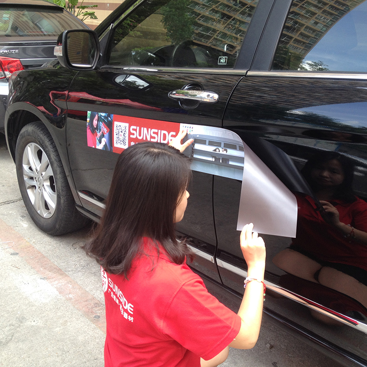 我们的磁贴是由磁粉和乙烯基制成的。它的粘合面有纹理,安装时可以很容易地去除气泡。你可以把它放在任何含有铁材料的表面上,如汽车、卡车、冰箱等。当不想使用它时,可以把它取下,它不会损坏车体,冰箱表面,可以重复使用。我们可以全彩色打印,也可以裁剪成任何形状。有三种薄膜选择:哑光/光泽和反光。